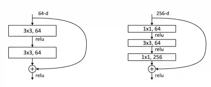 我们来计算一下1*1卷积的计算量优势:首先看上图右边的bottleneck结构,对于256维的输入特征,参数数目:1x1x256x64+3x3x64x64+1x1x64x256=69632,如果同样的输入输出维度但不使用1x1卷积,而使用两个3x3卷积的话,参数数目为(3x3x256x256)x2=1179648。简单计算下就知道了,使用了1x1卷积的bottleneck将计算量简化为原有的5.9%,收益超高。