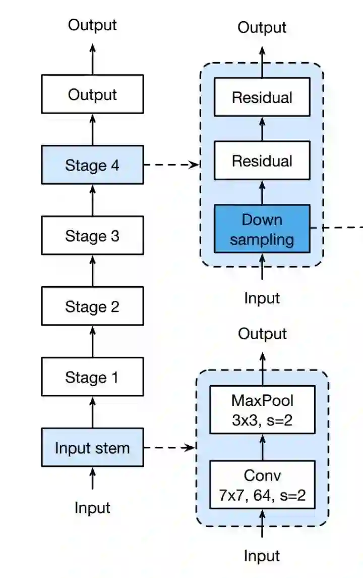 所有的ResNet网络输入部分是一个size=7x7, stride=2的大卷积核,以及一个size=3x3, stride=2的最大池化组成,通过这一步,一个224x224的输入图像就会变56x56大小的特征图,极大减少了存储所需大小。