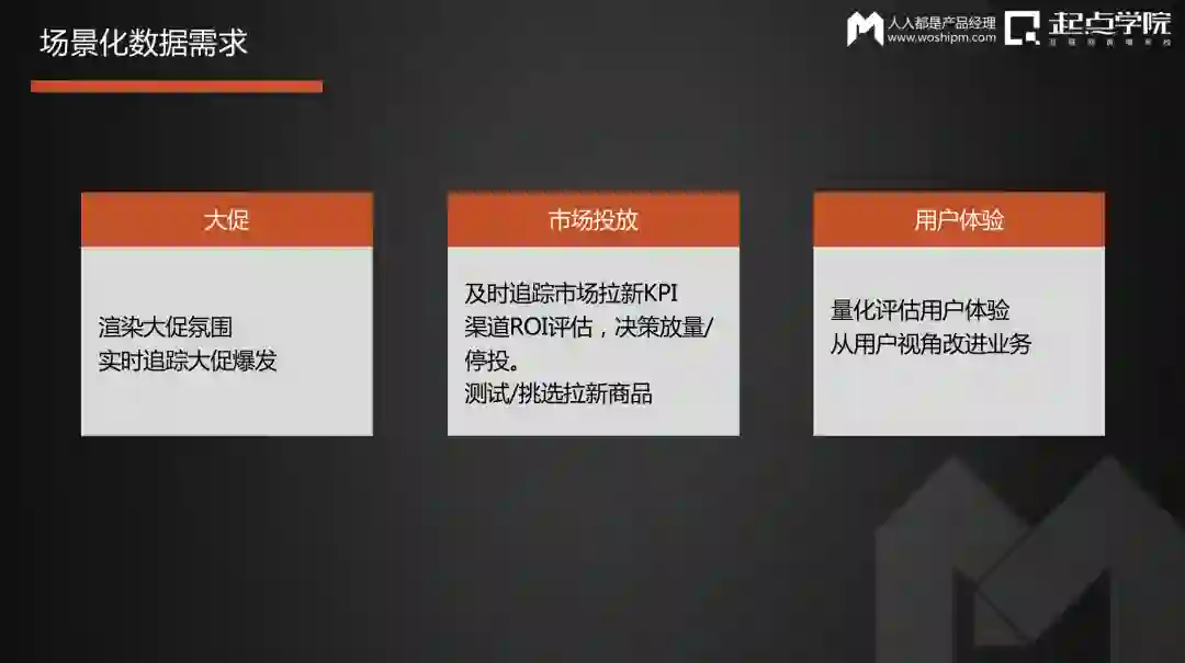 在日常接到的用户数据需求中,我们发现的一些数据需求场景,相对于作为整个严选业务数据监控体系的一部分,作为一个垂直场景的数据解决方案会是一种更好的表达,比如大促、市场投放、用户体验等数据需求场景。大促是电商最重要的节日,要渲染大促氛围,要实时追踪大促的爆发效果,以进行运营动作的及时调整。市场投放要及时追踪市场拉新KPI,及时评估渠道ROI来决策放量/停投,要测试/挑选拉新的新品等。互联网产品都是以用户为中心,网易更是极度重视用户体验,如何量化评估用户体验,如何从用户视角改进业务。