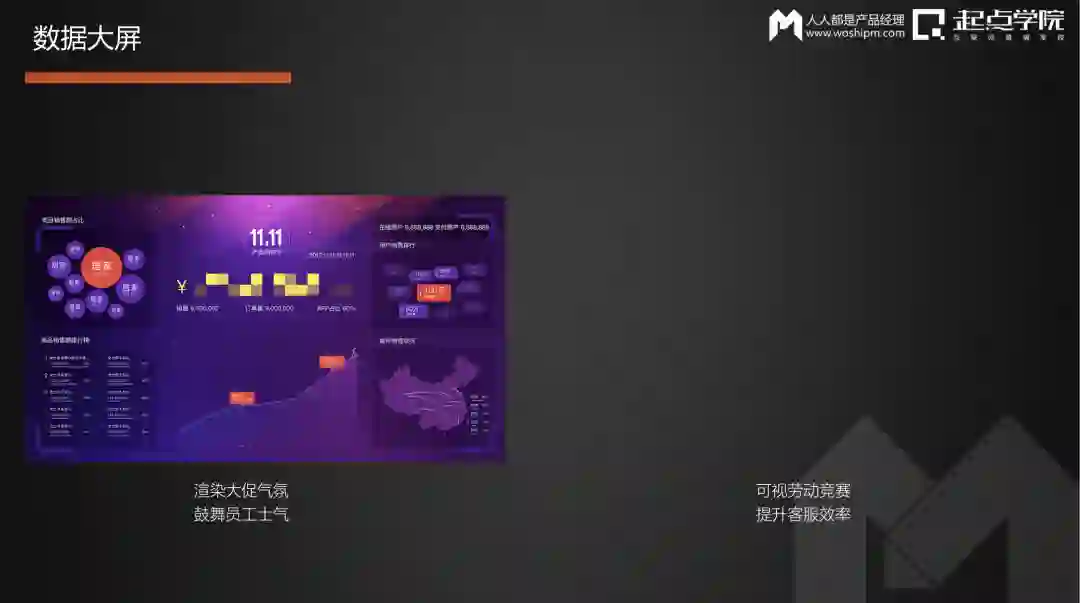 针对电商大促场景化数据需求,我们设计开发了电商数据大屏和客服数据大屏。在17年双11之前,我们开发了第一版严选电商双11数据大屏。跟业界双11数据大屏类似,数据大屏通过主动的实时数据呈现,让业务实时追踪大促爆发。通过炫酷的视觉样式和动画来渲染大促氛围。在电商双11大屏上线后,我们客服部门负责人找到我们,希望帮他们在下一次大促前做个客服数据大屏。由于没找到mock数据的客服数据大屏(下图的大促数据大屏数据是mock的),且客服数据大屏上数据太多打码难度太大,大家根据大促数据大屏自行脑补下UI吧。客服数据大屏包含实时的会话、排队、坐席数据,还有满意度、CPD、满意度报警、超30分钟会话等排行榜。我们发现电商数据大屏只在双11、周年庆等极少数电商大促节日的正点时段使用,但是客服数据大屏在我们两地的客服部门长期放了好几块。这种现象让我想到在房产中介看到的月度榜单墙,客服大屏是一种更实时的可视化的劳动竞赛榜。