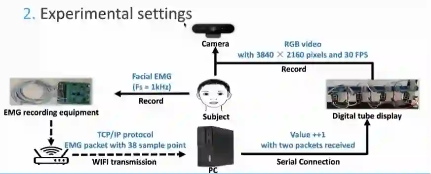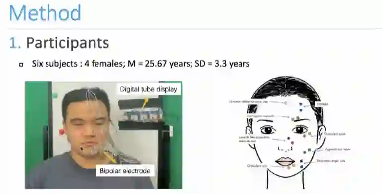 在方法的部分,鲁同学分别介绍了被试、面部肌电采集设备(电极片分布)和采集场景布置。
