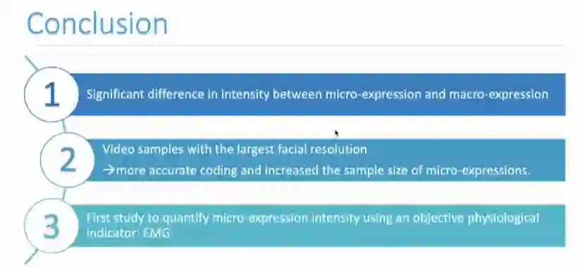 最后,鲁同学对报告进行了总结,并提出使用客观生理指标-肌电信号来量化微表情强度特征的研究是对微表情的生理机制研究领域,一个具有创新性方向的初步探索。