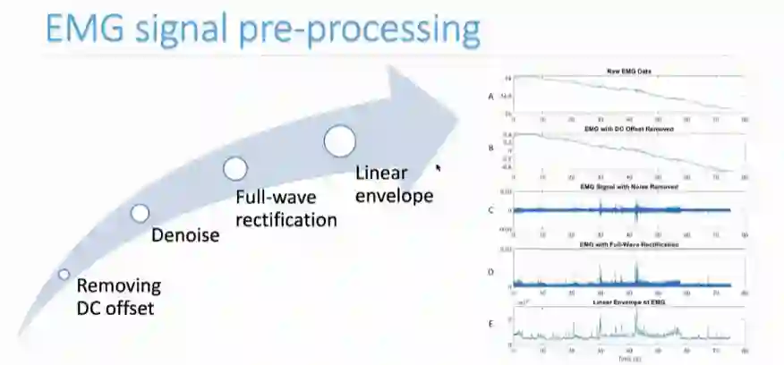 收集面部肌电信号后需要进行信号预处理,操作包括去除直流电干扰、滤波降噪、全波整流、线性包络四部分。