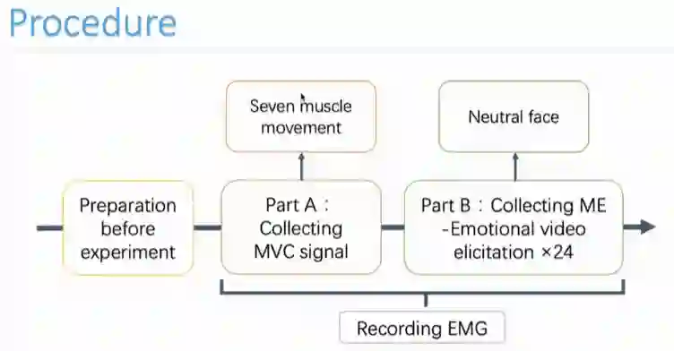 在具体流程部分,首先采集每个被试不同肌肉通道的最大自愿收缩(MVC),然后通过让被试观看情绪刺激材料,诱发微表情。