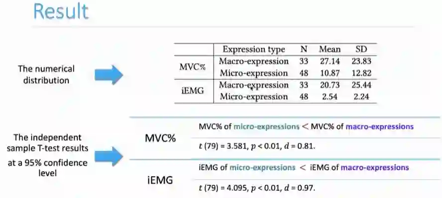 实验结果部分,鲁同学等人共得到81个具有对应肌电信号的表情数据,其中33个宏表情,48个微表情。在两个指标上的数据分布,如下表中所示。通过MVC%指标和iEMG可以看出,微表情在强度和时间两方面都要小于宏表情,统计分析也得到了显著差异。