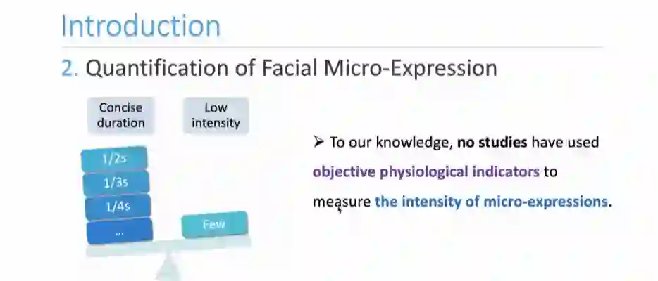 当前针对微表情特性量化的研究主要集中在其持续时间,而对其低强度动作特性的关注很少。鲁绍愿同学在王甦菁老师的指导下首次基于客观生理指标,即面部肌电信号,量化微表情的动作强度进行研究。相关成果:A more objective quantification of micro-expression intensity through facial electromyography,已被ACMMM2022 workshop FME接收。