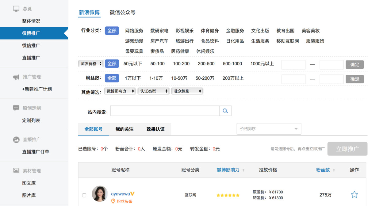 另一半的营收来自中小客户。在微博微任务的基础上,天下秀成立了撮合中小企业、电商微商和自媒体的平台 WEIQ。像微商、淘宝店铺这样的年投放额在 50 万以下的小型客户,可以直接在 WEIQ 产品上挑选超过 81 万和 IMS 签约的达人、网红、自媒体以及明星来投放营销预算,其具体逻辑和微博微任务一脉相承,只不过多了微信、 映客、一直播等各类社交媒体平台罢了。