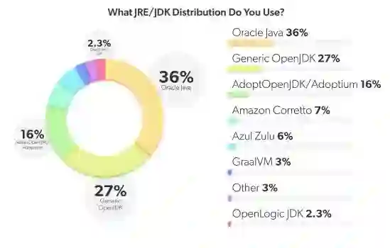 今年 OracleJDK 份额从 2020 年的 48% 下降到 36%。GraalVM 从 2020 年的 0.25% 上升到今年的 3%。