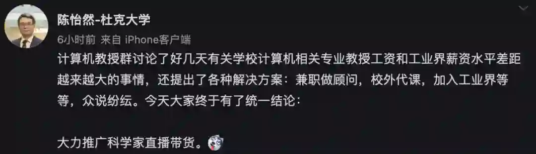 很多人昨天才第一次知道,带货原来这么赚钱!杜克大学教授陈怡然微博调侃,解决计算机学术界和工业界收入差距的办法终于找到了:全面推广「科学家带货」!大学教授收入究竟如何,真比不上互联网大厂吗? >>加入极市CV技术交流群,走在计算机视觉的最前沿