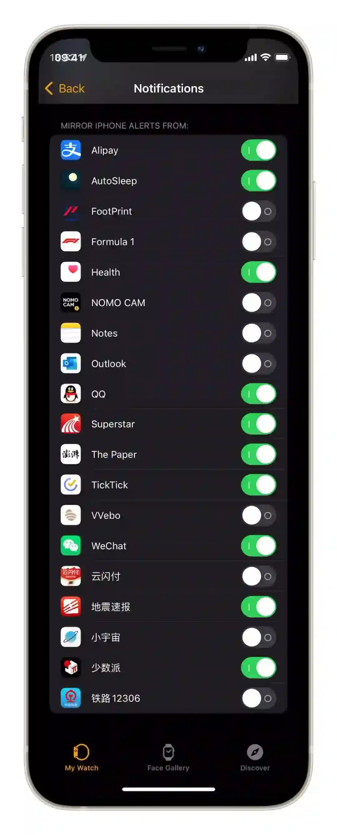在 Apple Watch 上,我会保留比 iPhone 更少的通知权限,只保留最基本的通知需要。Apple Watch 像是一个通知的筛选器:新闻类的消息放着不管,一会儿再看(例如澎湃新闻);无需回复的消息轻点忽略,拜拜了您嘞(例如不需要及时处理的班级通知、滴答清单的任务提醒);急需回复的内容再考虑拿起手机(例如学习通的签到)。