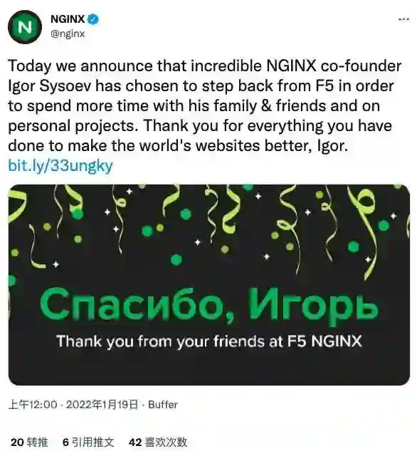 1 月 19 日,NGINX 在官方 Twitter 上宣布 NGINX 创始人 Igor Sysoev 从 F5 离职,以便将更多的时间留给陪伴家人和朋友,以及个人项目。NGINX 团队表示,“感谢他所做的一切让全世界的网站变得更好。”