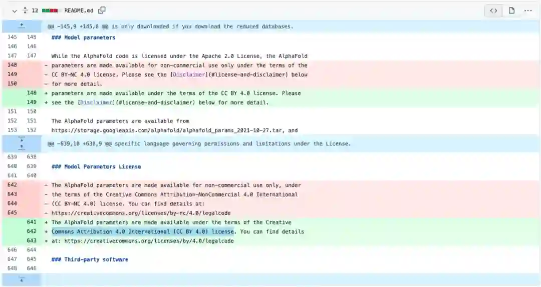 Google 旗下的人工智能 Deepmind 公司近期修改了 Alphafold2 的许可,当前“AlphaFold 参数根据知识共享署名 4.0 国际版(CC BY 4.0)许可条款提供”,而在之前 Alphafold 权重和数据仅在知识共享属性-非商业4.0国际(CC BY-NC 4.0)许可证的条款下可用于非商业用途。如今随着协议的更改,Alphafold2 也可以用于商业用途。