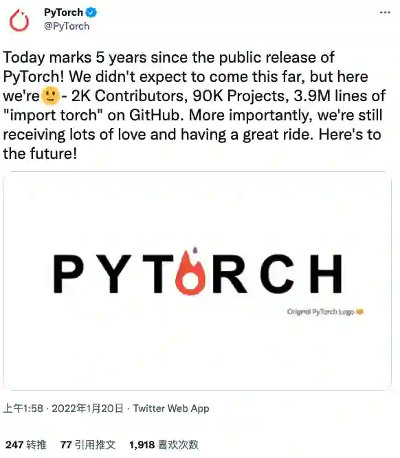 2022 年 1 月 20 日是开源 Python 机器学习库 PyTorch 公开发布 5 周年的纪念日。为此 PyTorch 在 Twitter 上发布博文庆贺道,“今天是 PyTorch 公开发布 5 周年的日子。我们没有想到会走到今天,当前在这一开源库的基础上,我们拥有——2K 的贡献者、90K 项目、GitHub 上 390 万行的 “import torch”。更重要的是,我们收获大量的支持,也有一个伟大的旅程。为未来干杯!”