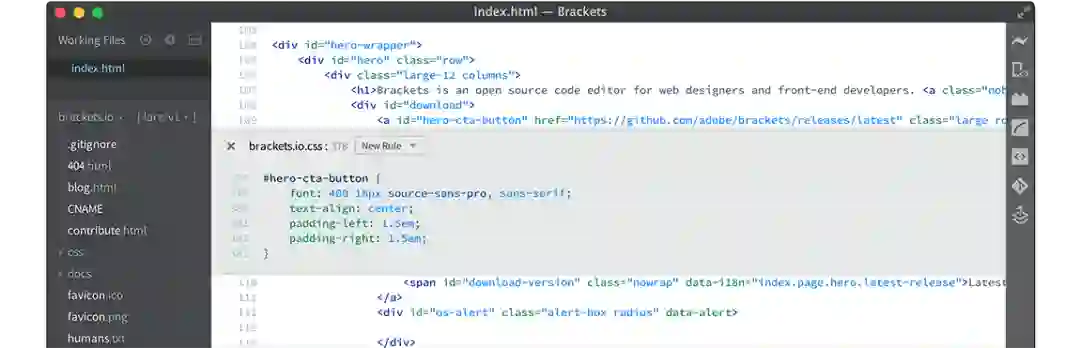 Brackets 是一个主要专注于 Web 开发的、轻量级但功能强大的现代文本编辑器。它由 Adobe Systems 创建,是根据 MIT 许可证获得许可的免费开源软件,目前由开源开发人员在 GitHub 上维护。它是用 JavaScript、HTML 和 CSS 编写的。