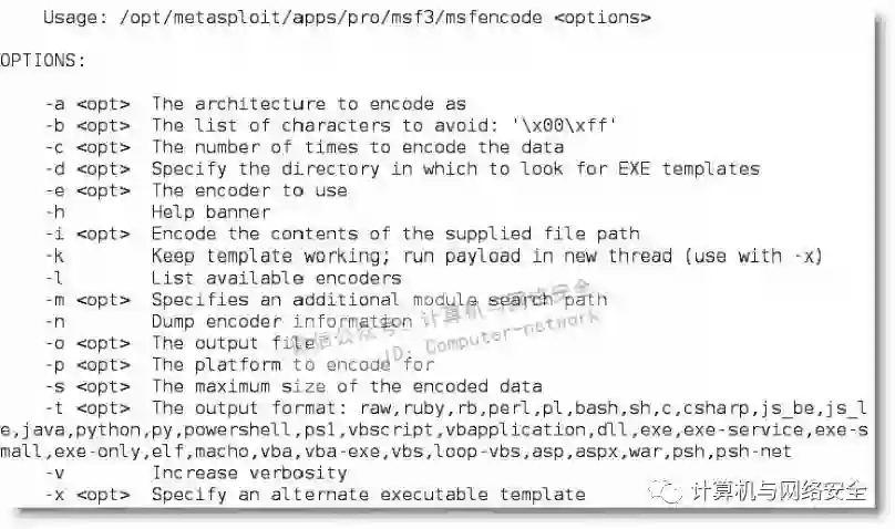 shikata_ga_nai是一个好的并且通用的编码器。此编码器对4个字节的密钥采用多态XOR添加反馈进行编码,并且它是被Metasploit评为“优秀”的唯一一款编码器。