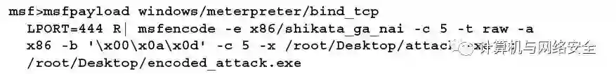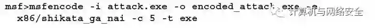 使用shikata_ga_nai协议,对attack.exe代理进行五次编码。每一次都是对上一次结果的重新编码,这样就更难侦测到。但是,可执行文件的大小也在增加。