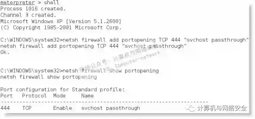 为了增加端口到本地防火墙,需要在meterpreter提示符后输入shell命令,然后使用适当的命令规则。当对规则进行命名时,比如svchostpassthrough,名字应该暗示此规则对系统的正常运行有重要作用。示例命令显示如下。