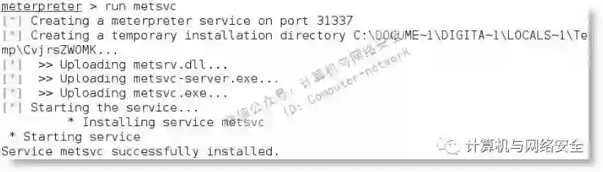 通过调用run命令,执行metsvc代理如下图所示。可以看到,它创建了一个临时安装的目录,上传三个文件(metsrv.dll、metsvc-server.exe和metsvc.exe),随后启动metsvc。