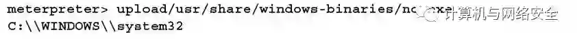 Netcat存储在Kali的/usr/share/windows-binaries库中。从内部meterpreter输入如下的命令,可以上传到被攻破系统中: