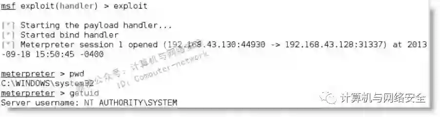 执行exploit命令后,在两个系统中直接打开一个会话,它允许提升权限,并实现其他从命令行启动的功能。exploit命令执行的结果如下图所示。