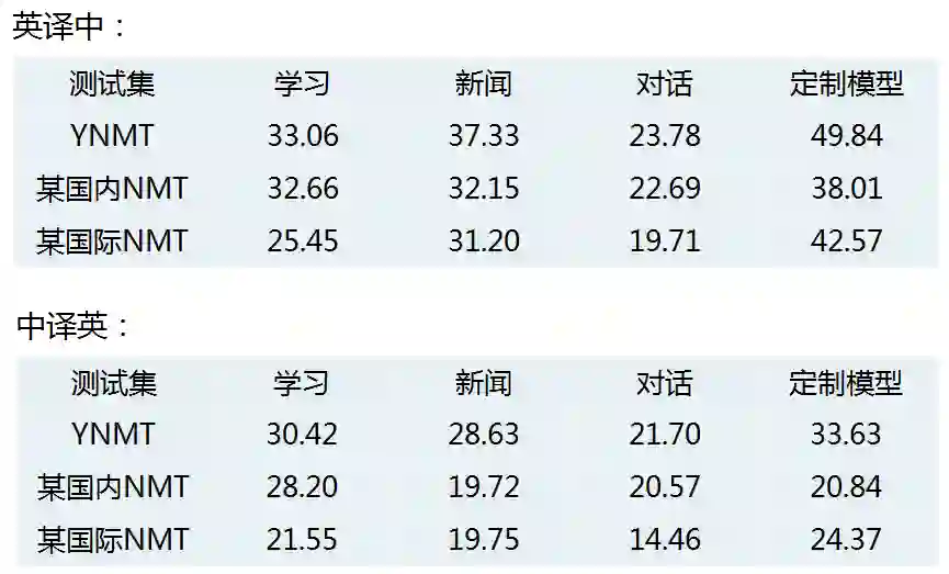 有道神经网络翻译(YNMT)BLEU值测评结果