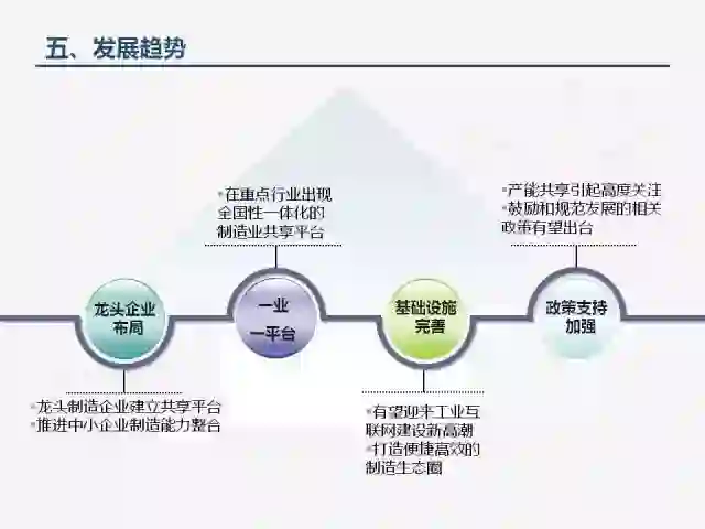 未来将会有更多的制造业龙头企业建立基于互联网的制造业共享平台,聚焦产业链协同,开放自身优质资源并提供社会化服务。专业的细分行业平台会是未来制造业共享的重要方向,在重点行业有望出现全国性一体化的共享平台,呈现“一业一平台”态势。制造业产能共享的基础设施将不断完善,有望迎来工业互联网建设的新高潮。在这种大背景下,制造业产能共享作为未来共享经济的主战场,随着认识和实践的不断成熟,鼓励和规范发展的指导意见、发展规划、试点示范等相关政策有望出台。