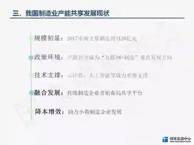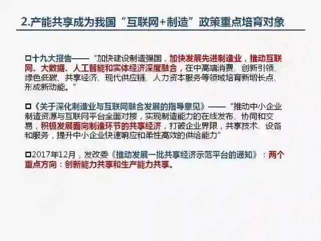 二、产能共享成为“互联网+制造”重点发展方向,党的十九大报告和多份国家政策文件里都提出鼓励发展面向制造业的共享经济;
