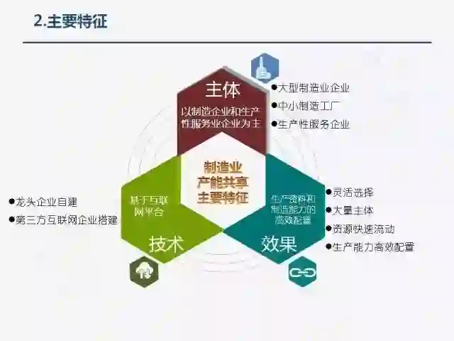 主要特征有:以制造企业和生产性服务业企业为主体特征、基于互联网平台的技术特征、实现生产资料和制造能力的高效配置的效果特征。
