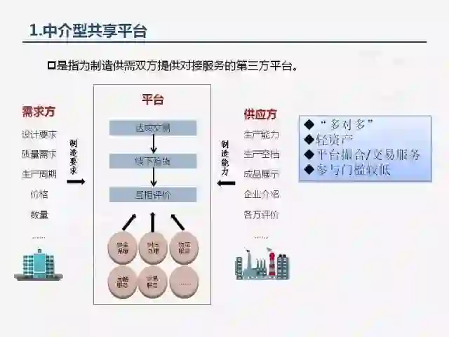 一、中介型共享平台,是指为制造的供需双方提供对接服务的第三方平台,平台自身不拥有诸如设备、厂房等制造资源;