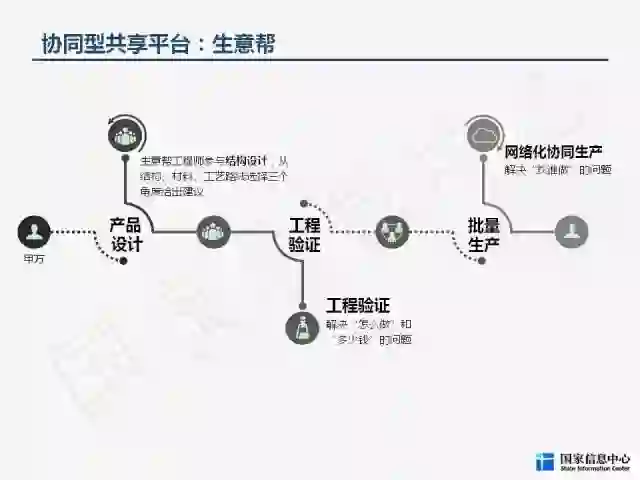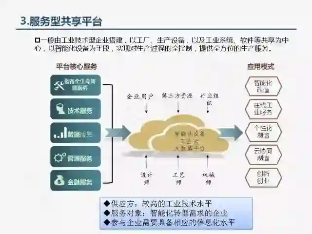 三、服务型共享平台,由工业技术型企业搭建的平台,以工业系统、软件、智能控制、工业云等技术服务共享为中心,提供全方位的生产服务;