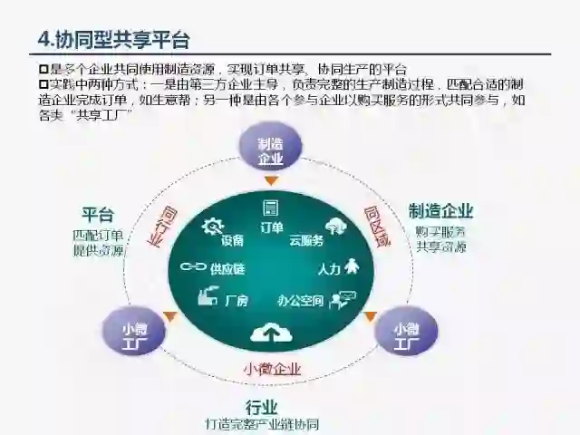 四、协同型共享平台,是指多个企业共同使用云服务、生产设备、工厂生产线、办公空间、工人等资源,实现订单共享、协同生产的平台。