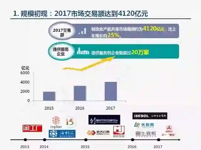 一、2017年制造业产能共享市场规模约为4120亿元,比去年增长约25%,通过平台提供服务的企业数超过20万家;