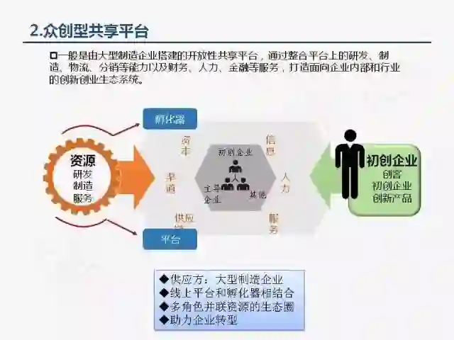 二、众创型共享平台,是由大型制造企业搭建的开放性平台,通过整合平台上的研发、制造、物流、分销等能力以及财务、人力、金融等服务,打造面向企业内部和社会的创新创业生态系统;