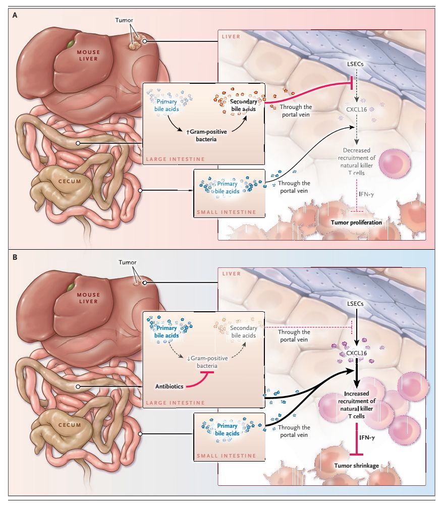 Ma教授等人发现,抗生素治疗可以消耗小鼠体内革兰氏阳性细菌的菌落,而这些细菌可以将初级胆汁酸代谢为次级胆汁酸。次级胆汁酸可以抑制肝窦内皮细胞的活化,而初级胆汁酸可以促进肝窦内皮细胞产生趋化因子配体16 (CXCL16),最终促进肝脏对自然杀伤T细胞的招募,结果如图1所示。肝内恒定自然杀伤T细胞可以促进干扰素γ的释放,而干扰素γ具有抗肿瘤功效。在小鼠模型的一系列实验中,Ma等人研究发现,相比于对照组,肝脏中活化的自然杀伤T细胞可以导致较少数量的肝细胞癌和肝转移。在肺转移方面,两组未见明显差异。因此,通过操纵肠道微生物群调节胆汁酸成分可能是肝癌患者的一种新的治疗选择。