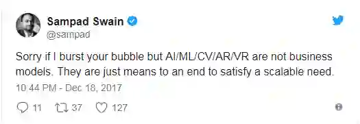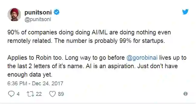 前Flipkart首席产品官(CPO)普尼特•索尼(Punit Soni)曾发推文道:“搞AI/ML的公司中90%从事的业务与AI/ML根本不沾边。”他补充道:“对于初创公司而言,这个比例可能高达99%。”