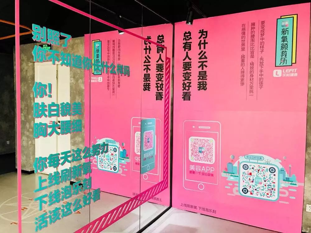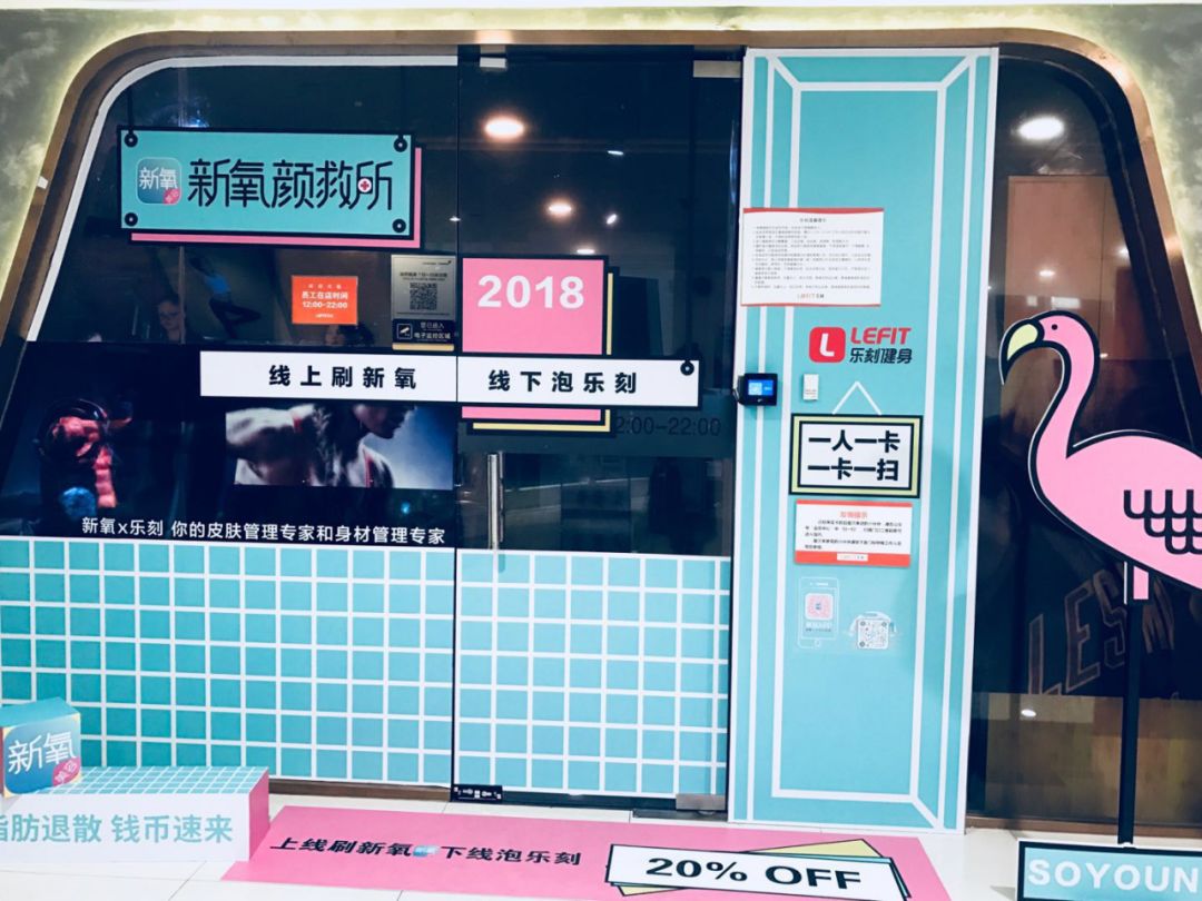 比如,新氧和乐刻健身的合作快闪店,健身房被刷上粉蓝撞色的墙面,衬着落地镜上slogan更为醒目——“身材管理上乐刻,皮肤管理下新氧”,背后的逻辑是,乐刻健身的消费群体注重自我管理,对于美、健康有一定追求,与新氧用户群有大量重叠,新氧与乐刻健身将身体的美和颜值的美叠加来吸引线下的眼球,快闪之中能帮双方高效获得新的目标用户。