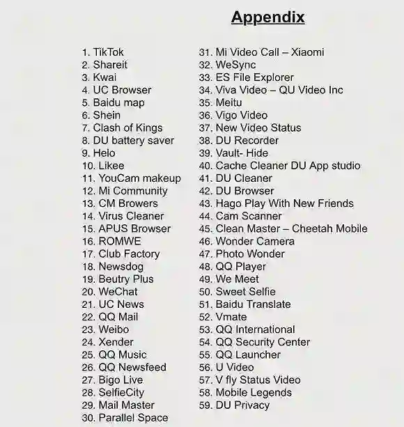 据《印度时报》29 日报道,印度政府当天在一份新闻稿中称,印度出于“安全”考虑,禁止包括抖音国际版 TikTok、茄子快传、UC 浏览器、微信、QQ、快手和美图等在内的 59 款中国应用,认为这些应用从事的活动有损印度主权、国防、国家安全和公共秩序。