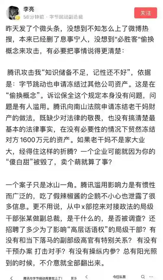 近日,腾讯与老干妈广告乌龙事件闹得沸沸扬扬。7 月 1 日晚上,字节跳动副总裁在其个人头条号上吐槽腾讯:“基础事实都没调查清楚,就可以直接启用公检法手段,竟然还成功冻结了对方1600万元!说明这家公司已经形成了用公检法打击一切不利于它的日常思维,而且简化到连调查都懒的去调查了。”