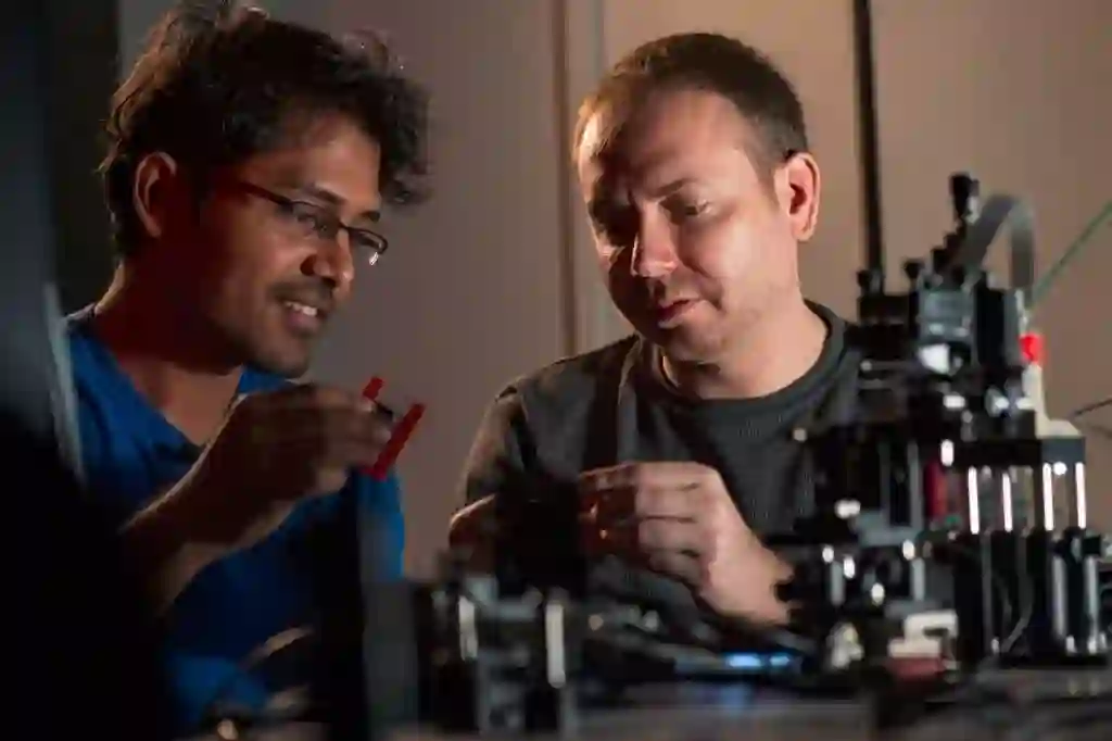 下图是莱斯大学的研究生Vivek Boominathan(左)和Jesse Adams正在搭建平面显微镜的实验。这款无透镜的平面摄像头可作为荧光显微镜,它能用于捕捉三维数据,并从视场中任何地方的物体构建图像。