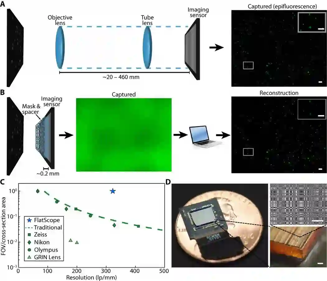 莱斯大学科研团队采用了一种不同的方法:利用所有电子摄像头中都有的电荷耦合器件(CCD)芯片捕捉入射光线。与之前的 FlatCam 项目一样,FlatScope 的视场等同于CCD传感器的尺寸,它可以按需变大或变小。通过定制的振幅掩模(amplitude mask)取代传统显微镜中的透镜阵列,因此它的外形是扁平的。