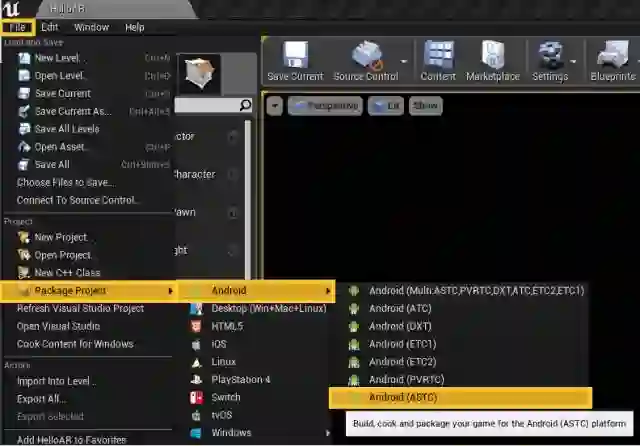 打包 HelloAR 项目。在菜单栏中选择 File > Package Project > Android > Android (ASTC)。