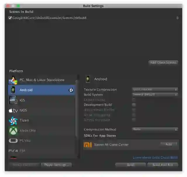 Scenes in Build 列出了您的项目中有哪些场景会被包含在您的构建中。按照下面的方法即可从 HelloAR 示例应用中添加场景到您的构建中: