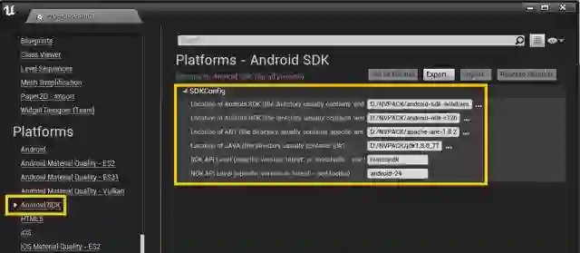 搭建 Unreal 编辑器以便进行 Android 开发。请确保安装了版本 7.0(API 等级 24)或以上的 Android SDK Platform。