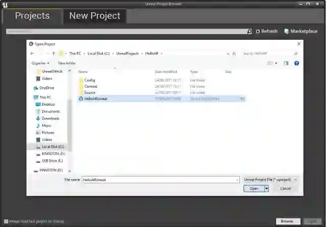 项目打包完成后,请确保您的设备仍连接着电脑。打开 Builds 文件夹,双击文件 Install_HelloARUnreal_Development-armv7-es2.bat (Windows 用户)或 Install_HelloARUnreal_Development-armv7-es2.command (Mac 用户),在您的 Android 智能手机上安装项目。