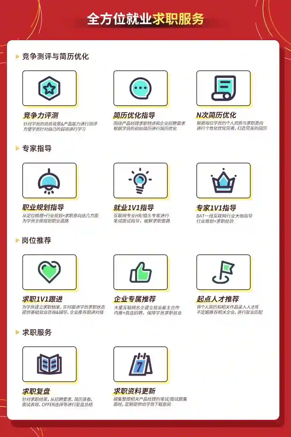 事实上,产品技能和求职技能同样重要,求职技能高低往往决定你能否拿到产品offer。因此,特训营另一个特色在于“就业”,基于企业招聘需求提供11项求职就业服务,由就业服务老师、招聘管家全程为你给你支招,知己知彼打有准备的仗,直到你能拿到Offer,成功入职为止。