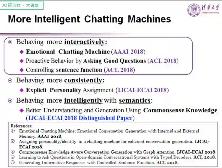 比如这 3 篇文章分别从情感交互、提问以及控制句式入手,试图解决机器的交互性问题;针对上下文一致性的问题,这几篇文章强调赋予机器人独立人格,这样机器人才不会问答过程中迷失自我;至于如何让机器人变得机灵,这篇文章建议可以从外部引入常识信息库,避免出现一些牛头不对马嘴的回答。