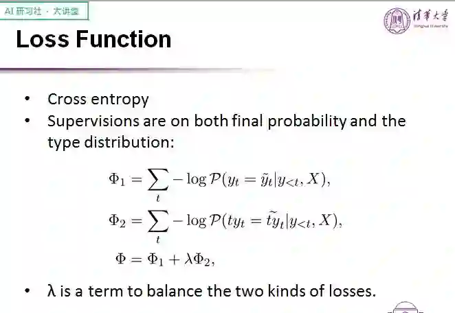 至于在损失函数这块,我们除了像一般的模型一样在词表的概率分布上做出了损失函数,同时也在词类的 gate 上加了监督,并且利用 lambda 这样一个超参数将两部分进行调和。