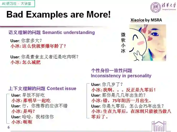 从更高层面来看,我们还发现了语义理解、上下文理解、个性身份一致性的问题。很多人在使用闲聊系统过程中发现,很多时候聊到一半便进行不下去,是因为机器人自己先把天聊死了。