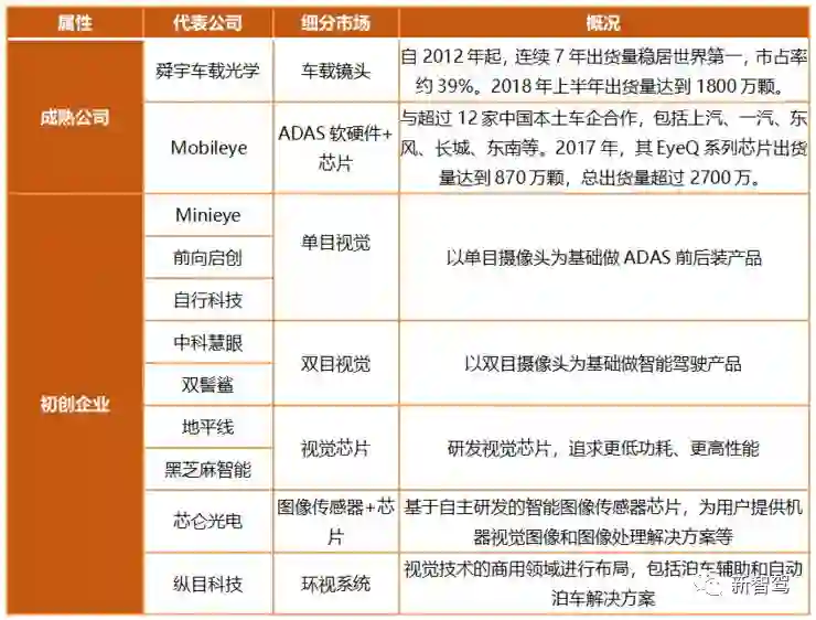 在《2018 智能驾驶视觉技术行业研究报告》中,我们将车载视觉技术供应商大致归为四类,分别为车载摄像头供应商、视觉芯片供应商、视觉算法供应商以及视觉整体方案供应商。